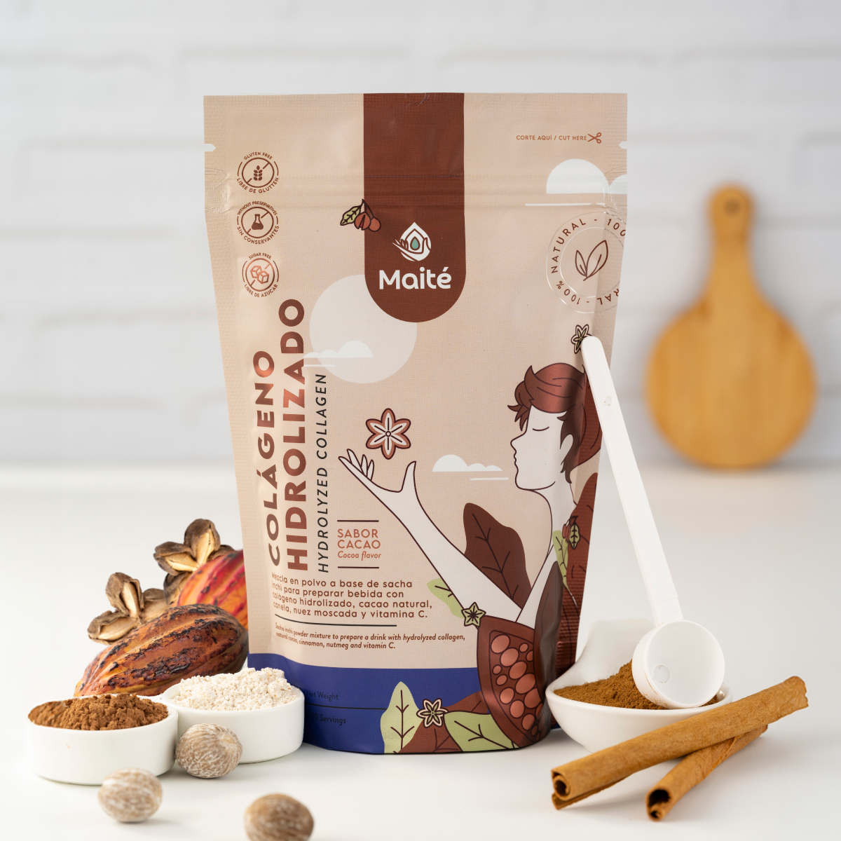 Colágeno hidrolizado, sacha inchi, cacao natural, canela, nuez moscada, vitamina C.