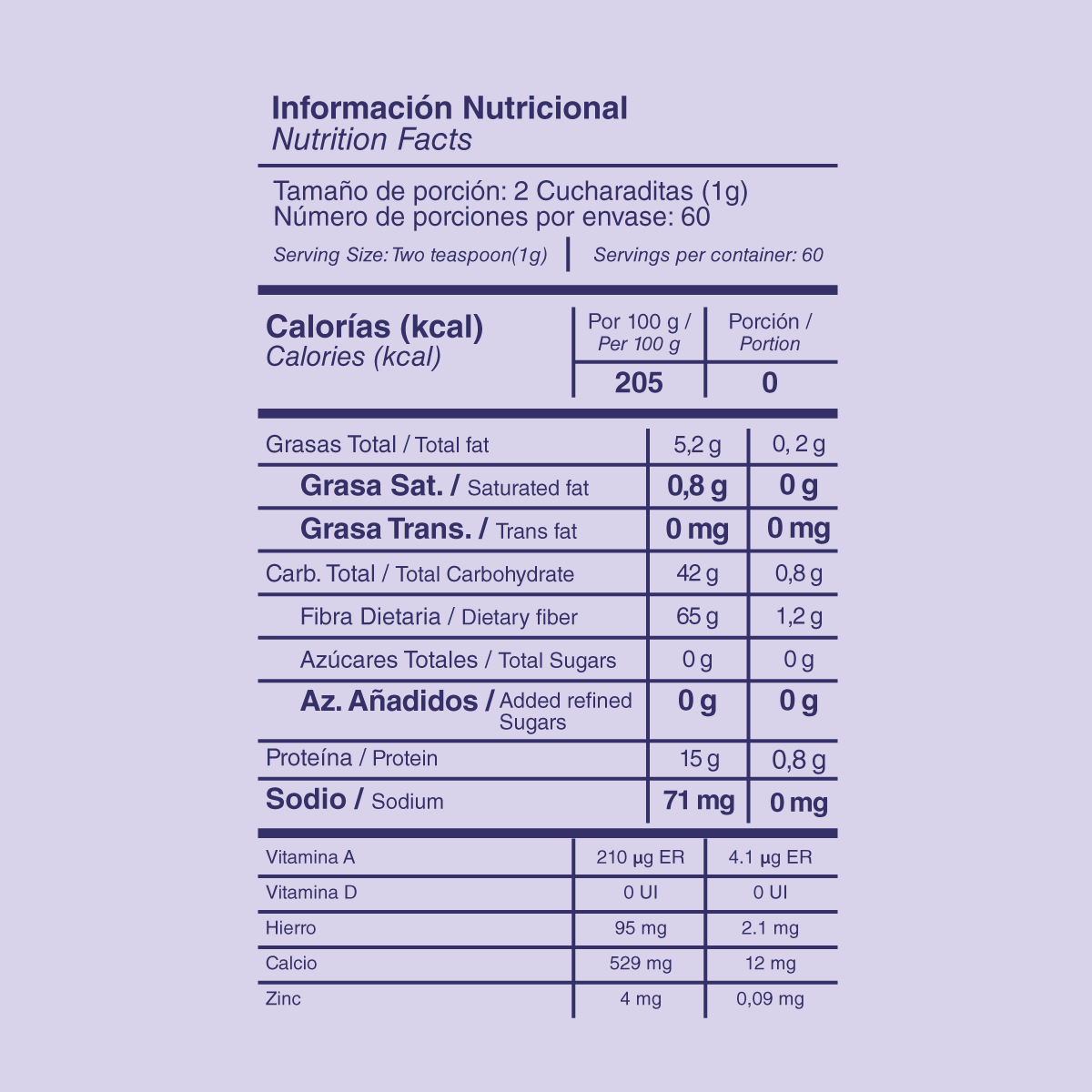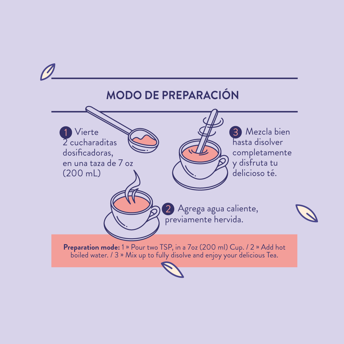 Té blanco, flor de manzanilla, cidrón, maca, miel de abejas, vainilla.